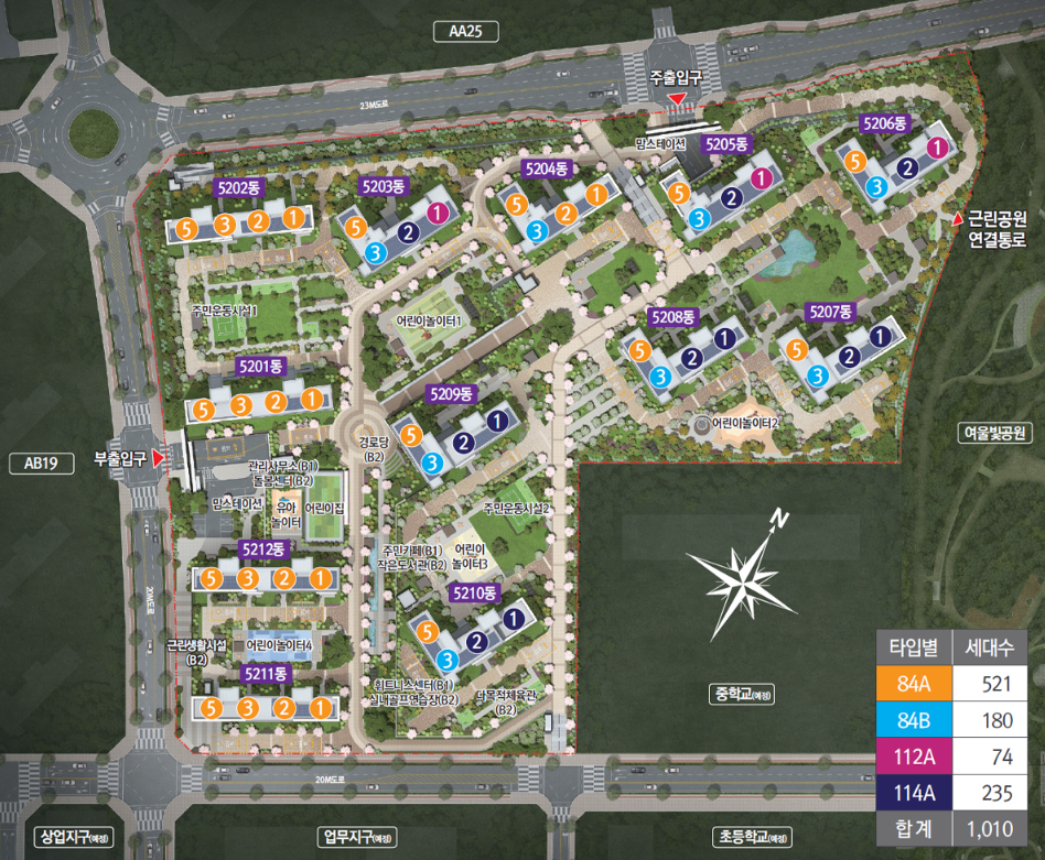 - 조경: 단지 내 테마 정원 + 녹지 산책로 조성