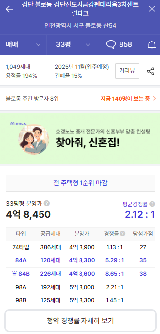 - 주변 시세: 검단 대광로제비앙 전용 84㎡ 약 4.8억~5.6억