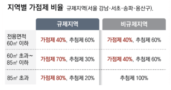 서울시 규제지역으로 전용 60㎡ 이하는 60% 추첨제 + 40% 가점제 적용