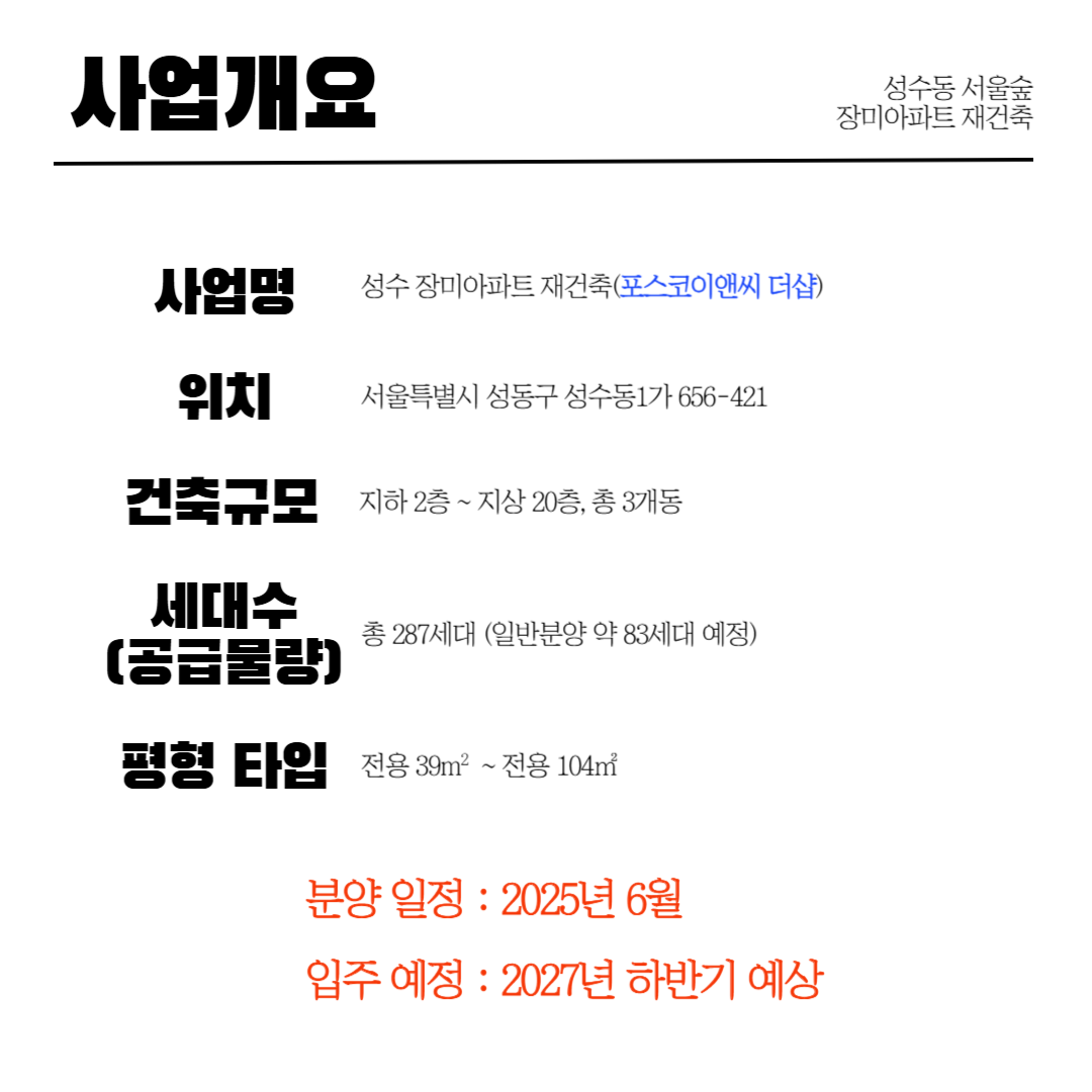 2025년 서울 핵심 입지에서 재건축 일반분양을 앞두고 있는 성수 장미아파트에 대한 정보가 속속 공개되고 있습니다.